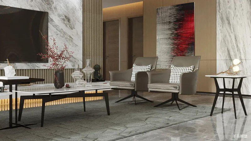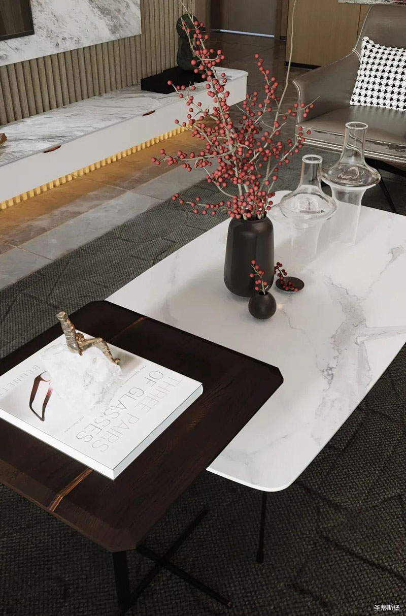 純美的線條,沉穩(wěn)的色澤,為空間定下了低調(diào)而華麗的基調(diào)。渾然天成的實(shí)木與巖板紋理,讓角幾蕩漾出一幅“水光瀲滟”的潑墨油畫。三兩紅枝點(diǎn)綴,表達(dá)著“枝頭并蒂祝吉祥”的美好祝愿。光影透過極簡(jiǎn)金屬幾腳,折射出一種隱藏的優(yōu)雅氣質(zhì)。大小、高低不一的天然材質(zhì)角幾組合在一起,時(shí)尚又個(gè)性,不僅便于移動(dòng),還表現(xiàn)的靈活且輕巧。