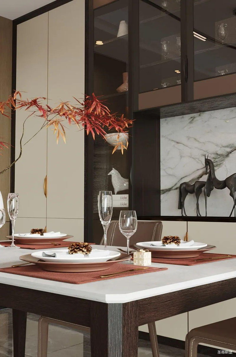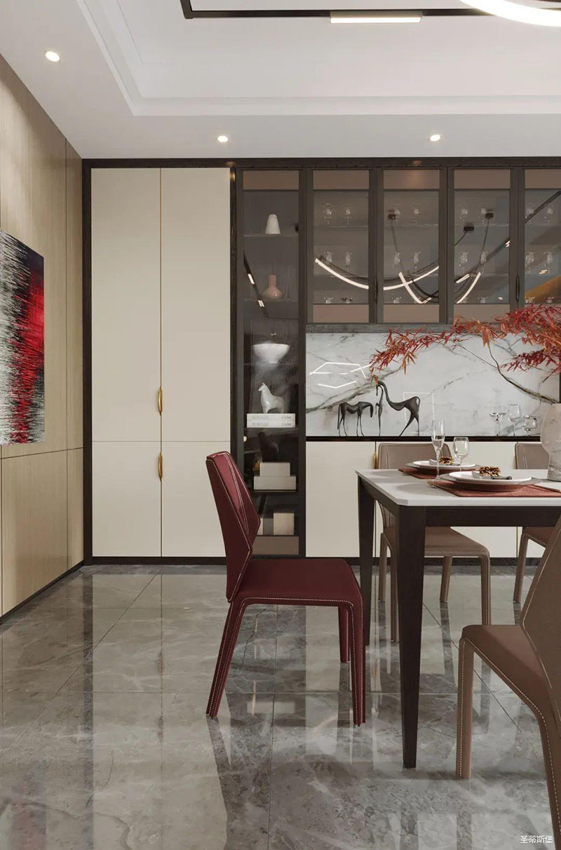 一字型布局的開放空間,強(qiáng)化了餐廚的開闊感,延伸了空間的舒朗視野。純白調(diào)的天然餐桌,與周圍空間融為一體,映襯著空間的純潔美好。意式簡(jiǎn)約的紅色餐椅,線條簡(jiǎn)潔凌厲到能輕易征服人心,一隅紅楓點(diǎn)綴其中,視覺層次感瞬間得到提升,讓人于靜簡(jiǎn)和清歡之間,感受人生百味。