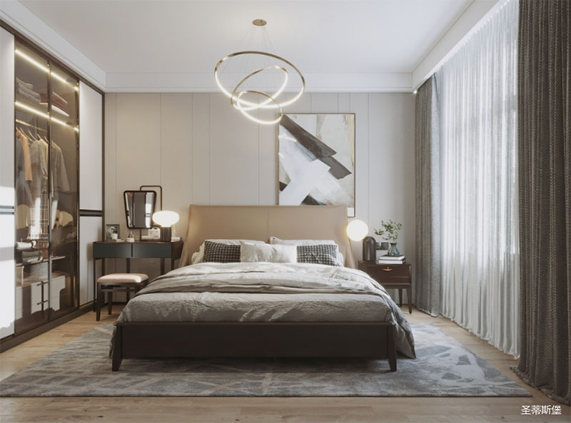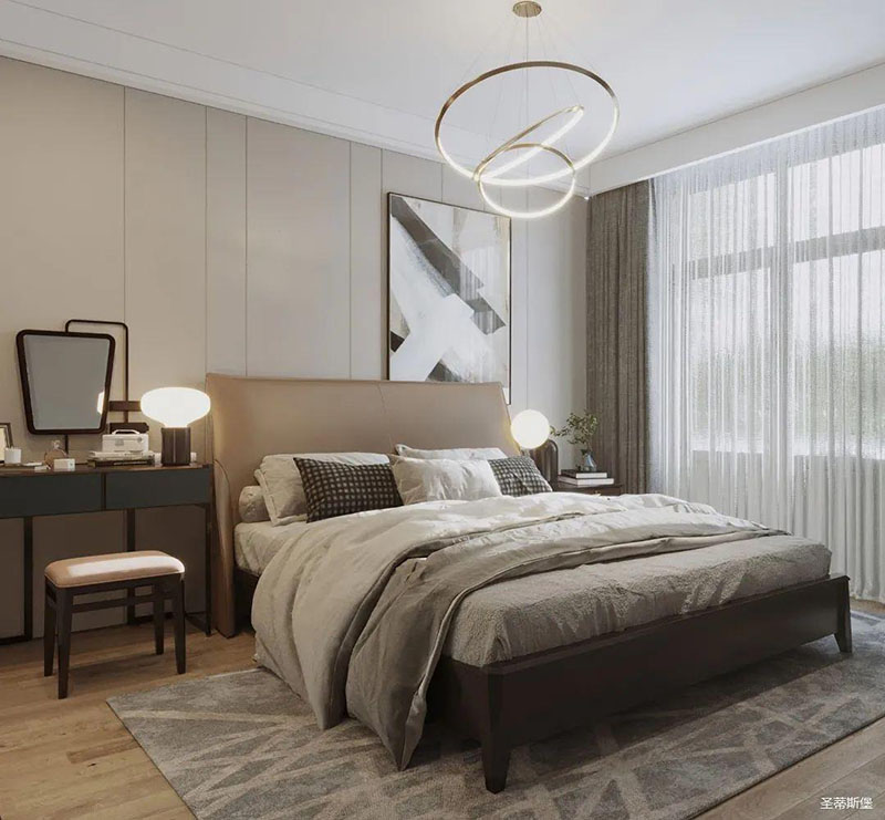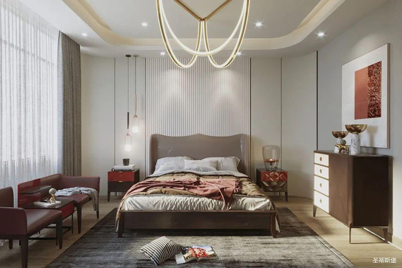 靈活變裝的主臥空間,自成獨(dú)特的設(shè)計(jì)語(yǔ)言與真摯的感情糅合。經(jīng)典意式極簡(jiǎn)軟床,流暢順滑的真皮床屏,賦予了空間溫馨高貴的氣息。酒紅實(shí)木質(zhì)感的床頭柜,整齊擺放,欲有“鴻運(yùn)當(dāng)頭”的美好寓意,塑造出一方簡(jiǎn)約知性的靈動(dòng)空間。