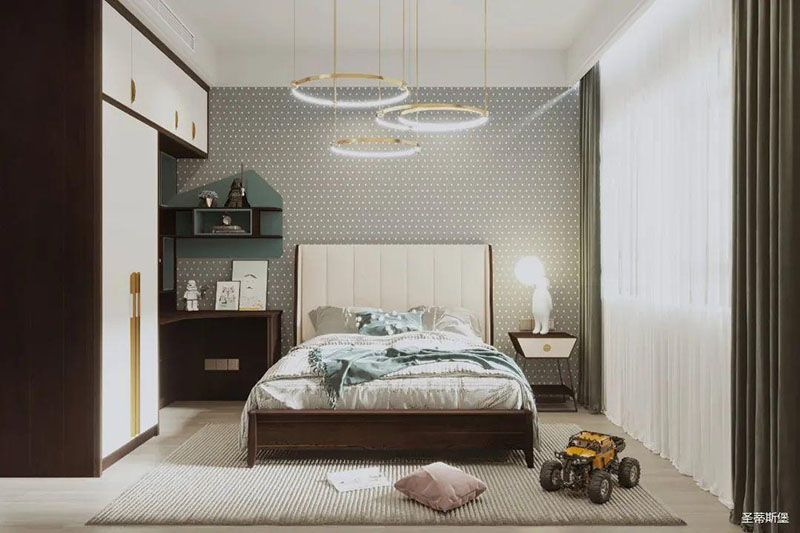 桌柜一體接壤設(shè)計(jì),絢麗與沉穩(wěn)相互襯托,足以達(dá)到空間最好的狀態(tài)。飽和又柔潤(rùn)的色塊,整齊坐落于床體柜身,通過極簡(jiǎn)規(guī)劃分配,刻畫出完美的實(shí)木紋理。造型獨(dú)特的床前燈,像一抹陽(yáng)光照進(jìn)心扉,散發(fā)著童真與夢(mèng)幻的味道,形成了獨(dú)有的輕奢精致感。