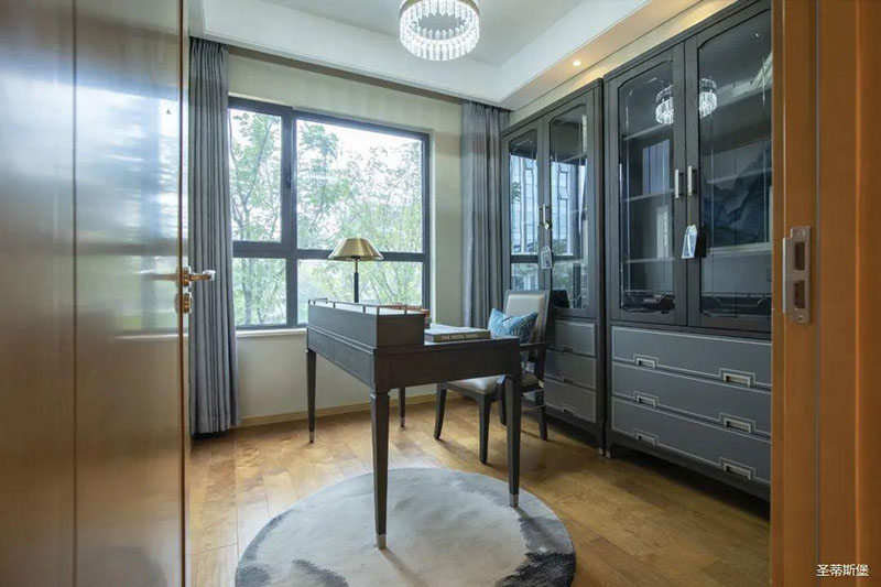 次臥高床屏由金屬鑲嵌,呈現簡約有序的線條,霧霾藍床屏與淺藍朦朧裝飾畫,窗簾相呼應,色澤搭配和諧自然,無不透漏著一種簡潔大方視覺體驗。