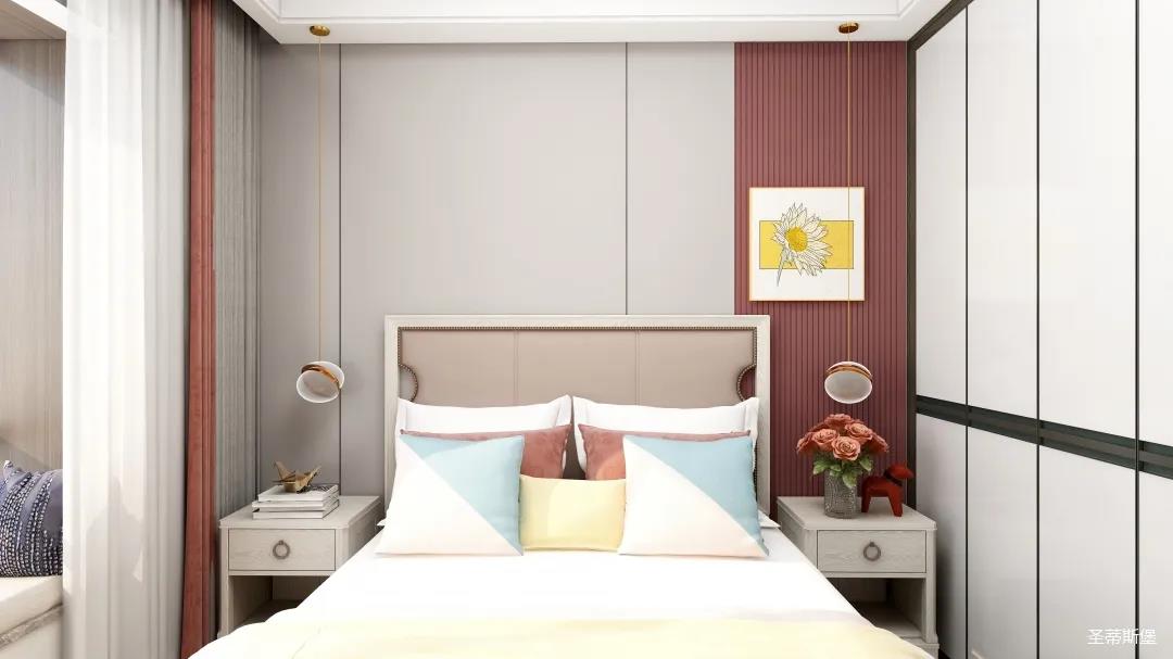 次臥簡約、精致,不多余復雜,小面積的簡約木飾面背景墻,給人以舒適的愜意感,設計師運用淺色系的木質地板,來烘托生活溫馨的漫步調。