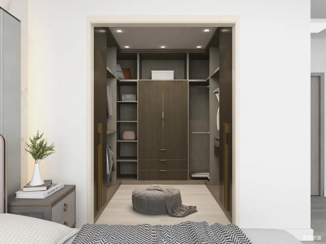 材質的交替與光影的變換,具有濃濃的現代簡奢色彩。獨一無二的英倫爵士灰定制柜,由延邊鑲嵌的香檳金拉絲金屬分割,線條流暢且奢華,不僅代表著時尚,也崇尚了實木韻味。設計師將現代、實用、精致的藝術設計風格應用其中,更是精致生活方式的藝術演繹。在平靜的空間中表現出獨特的藝術骨感,滿足我們對精致生活的精神追求。