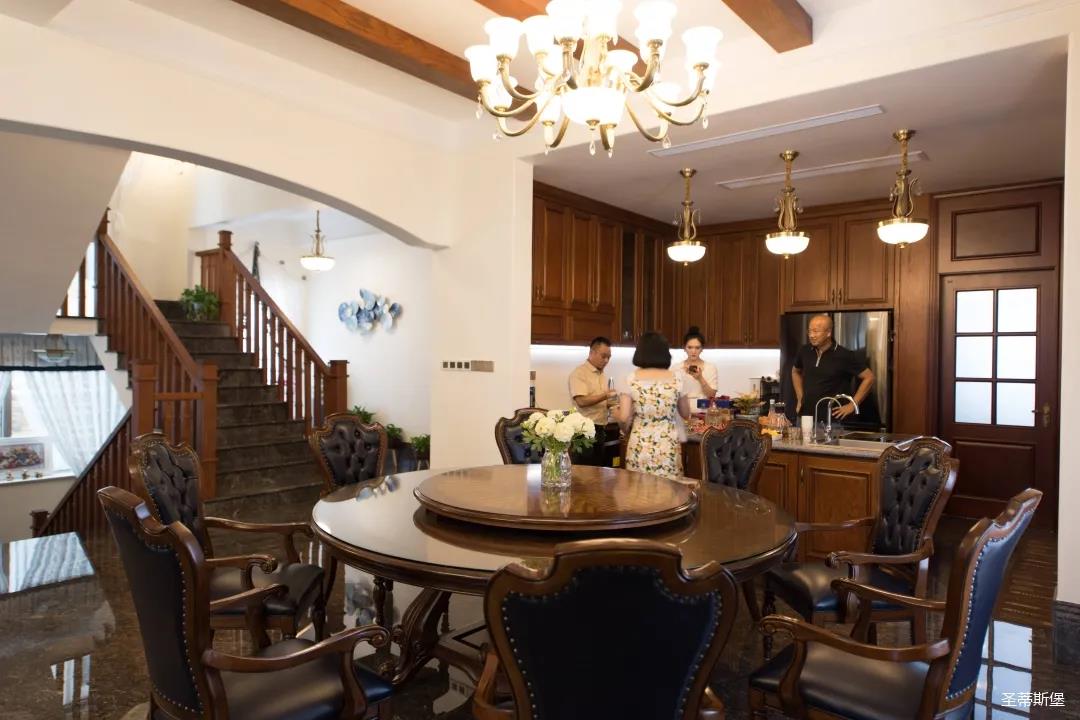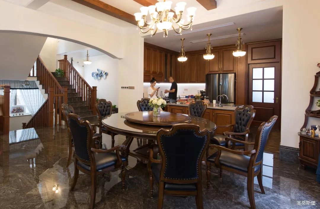 玄關進入轉角處,以穩重大氣實木為主色調的開放式中西餐廚空間,將一體化無隔斷設計貫徹到每個細節,采用了親膚真皮質感的餐椅,手工雕刻的曲線讓原本硬朗的空間變得格外優雅,自上而下,構成完整的美式空間氣度,在每天的生活點滴間,沉浸在美式風情中,更加隨性舒適。