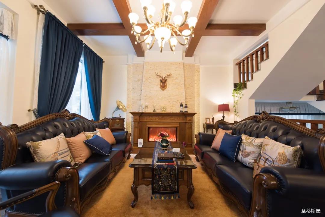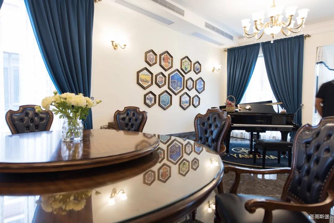 業主喜歡沉穩的美式新古典風格,整體統一的色調,呈現了一種莊重的典雅感。醇厚的實木真皮沙發,以古典的手法描繪出一種略帶復古的時尚奢華。一抹深藍迂回婉轉映照著空間的色系,明暗相對,符合著現代審美,卻又不顯沉悶。轉角處的一臺復古唱片機,還原了對音樂傾心的浪漫,抬起撥桿將唱針落下,隨著唱片的轉動和音樂的響起,美好的一天就此開始。
