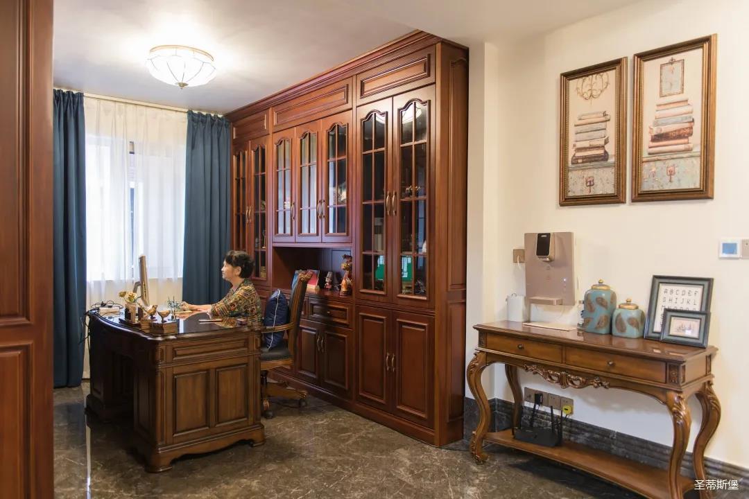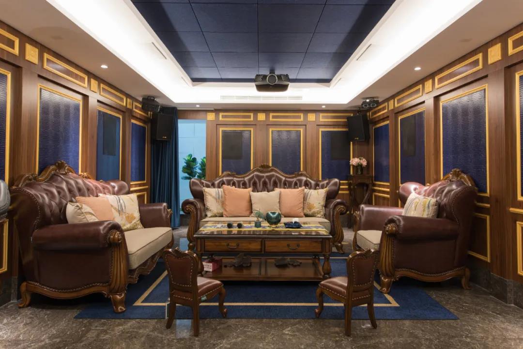 業主夫婦非常熱情好客,平時工作之余也會在家里邀三兩好友一起觀影,觀影室的整體設計容納著濃烈的古色古香,長方形圖案排列搭配復古的家具與配飾,精細的雕花藝術,于細節之間演繹著精致生活。不管時光如何輾轉變換,家的定義從不曾改變,它撫慰著我們的心靈,承載著我們的喜樂,從細膩的質感中感知家的點滴變化,才是對生活最真實的寫照。