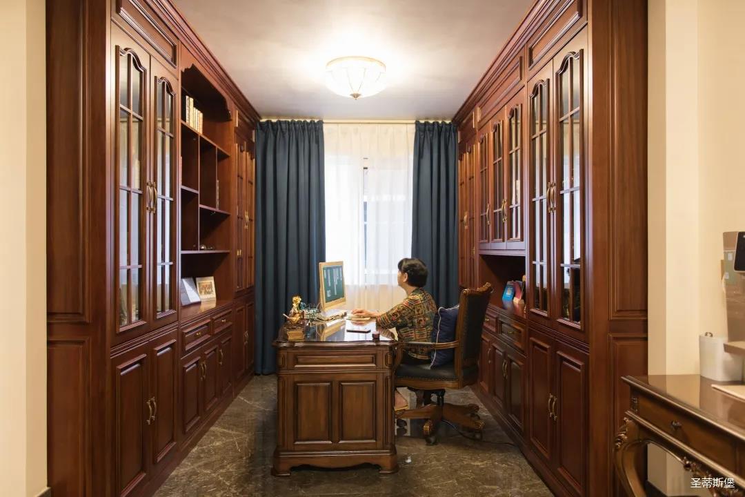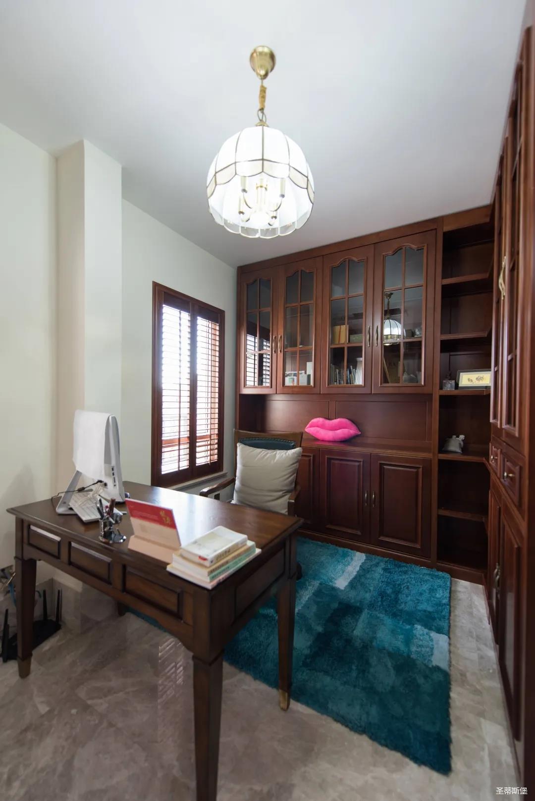 書房設立在二樓樓梯間,實木整體書柜為書房帶來自然的清香,開放式的空間布局把一家人鏈接在一起,增加彼此之間的互動交流與陪伴,同時也與樓下區域動靜分離,用一張書桌,一把舒適的皮質沙發椅,與主人開啟一段安靜的閱讀時光。