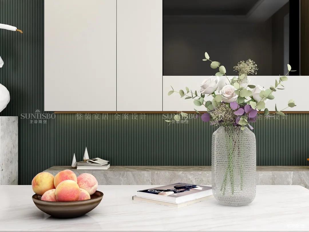餐廳全開放式的布局,遵循了家具收納的28原則,20%的封閉式儲納,收納不常用的雜亂物品,80%的半開放設(shè)計,展示軟裝飾物。餐邊柜將玻璃、金屬、實木材質(zhì)糅合分配,讓空間質(zhì)感倍增的同時,也讓用餐空間多了一份家的溫度。