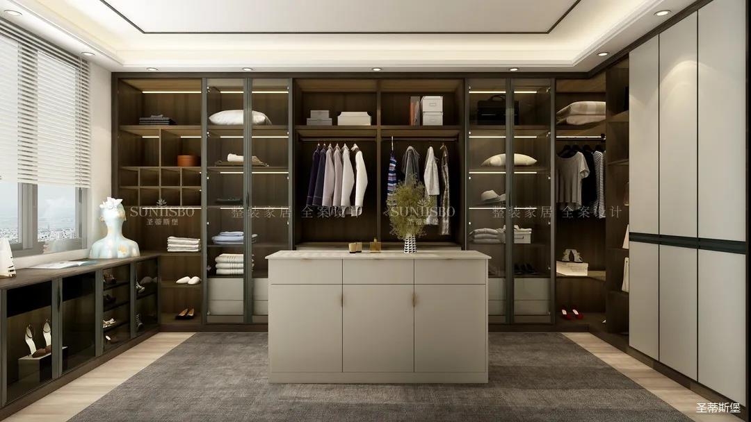 衣帽間采用了虛實結(jié)合的設(shè)計,構(gòu)筑起規(guī)整而有序的置物區(qū)域和功能齊全的收納系統(tǒng),煙熏色實木作為空間的主要元素,環(huán)抱著整個衣帽間,張揚又不失沉穩(wěn),恰到好處地搭配金屬玻璃置頂高門和感應(yīng)燈光系統(tǒng),挑高了空間效果,也詮釋著現(xiàn)代極簡線條美感和對極致的生活追求。