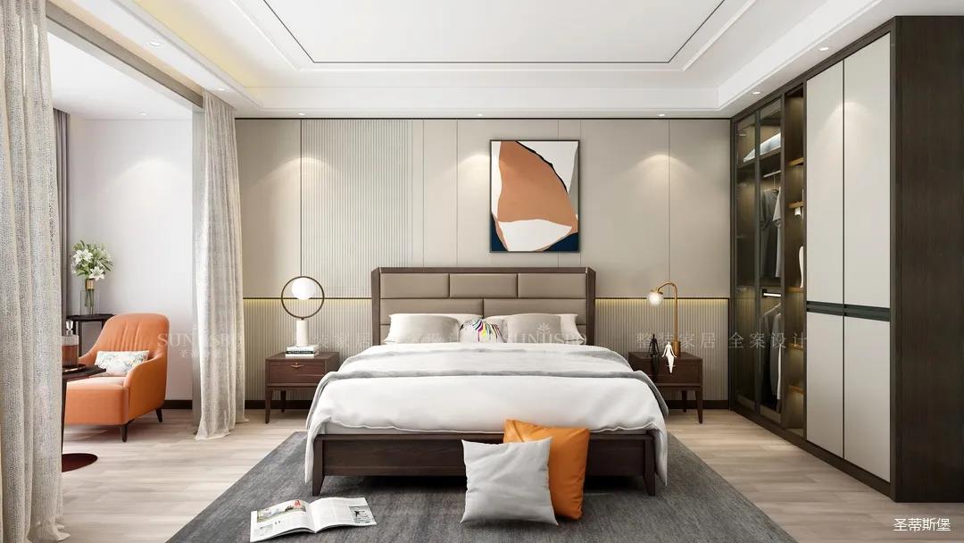 主臥運用了大面積落地窗圍合,整體的無主燈設(shè)計,凸顯了空間極簡潮流。無限引入窗外的移動光線,輕松為空間注入陽光的溫度,u型極簡金屬懸置著一個白色造型燈,讓空間從靜謐中生出無窮的變幻。家具設(shè)計偏向簡約舒適,造型雖不奪目,但細節(jié)質(zhì)感卻能經(jīng)得起時光的琢磨與品味。