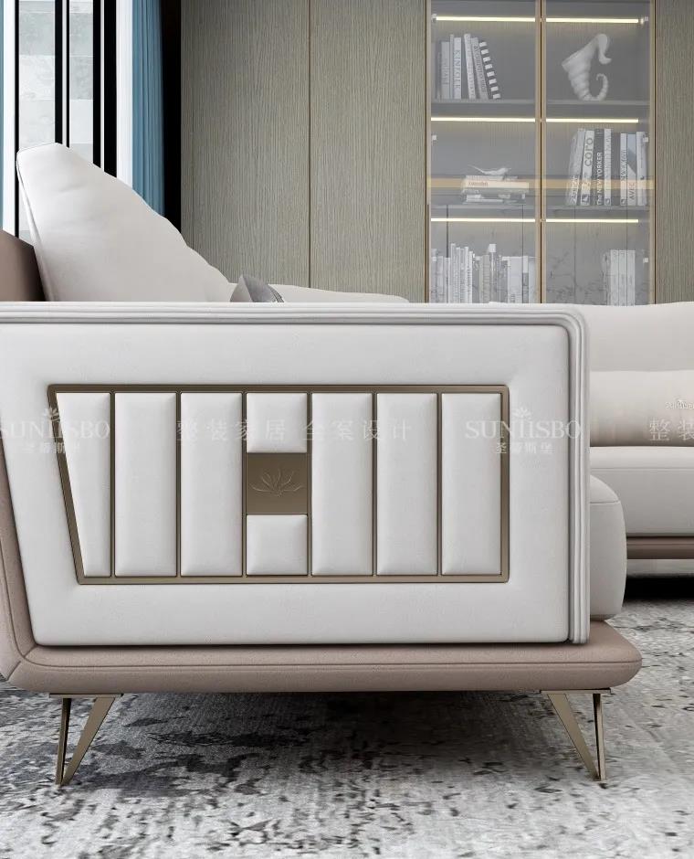 如果只是單純追求外在的簡約設計,如上所述,由于其造型線條簡單,缺乏裝飾形狀且裝飾元素很少,那么它的裝飾性就沒這么強,它的感覺更在當下的流行性,而不是長遠的裝飾性,我們洛斯系列在強調外形簡約的同時,講究內在細節的豐富,科技木皮嵌入與超纖藝術皮革飾面、實木藝術雕刻等,將產品的審美細節提升上來,以表現出更好的美感。沒有裝飾元素,空間會感到單調,這些具有獨特設計甚至極富創意的個性化裝飾元素,打破了洛斯在造型簡約上帶來的單調感與呆板感,將審美周期大幅度的延長。