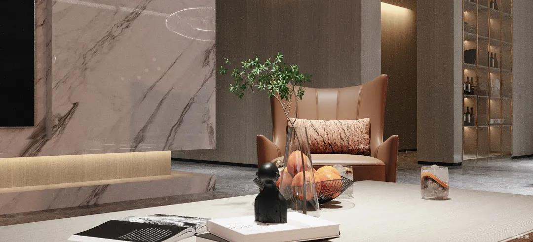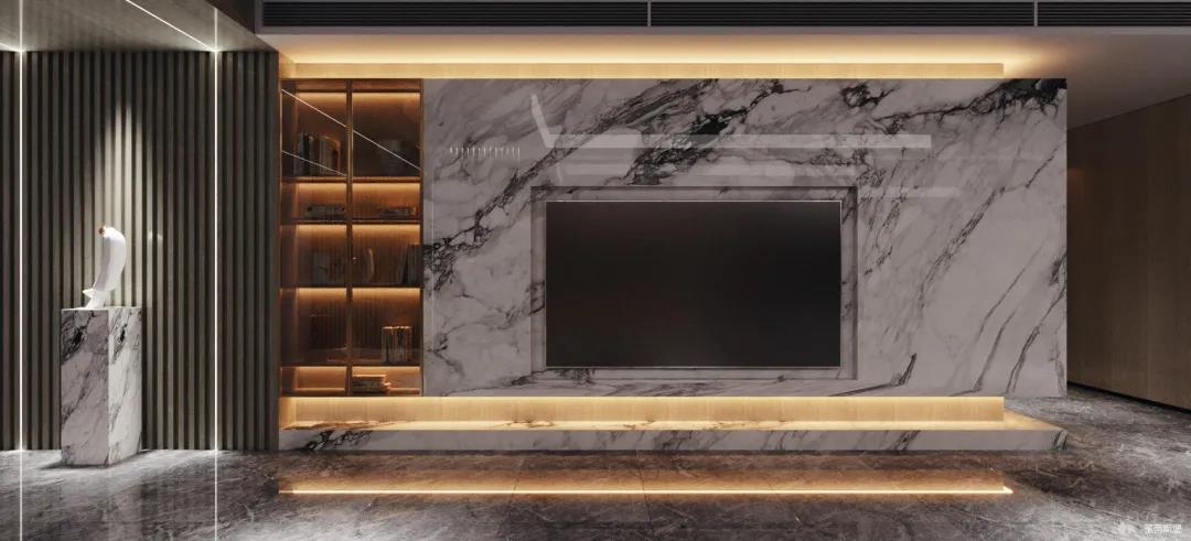 為了減輕現(xiàn)代都市工作的忙碌,客廳設計更偏向于對生活“解壓”的極簡,精選自然紋理的大理石與實木定制柜做一體化設計,并在電視背景墻下半部分做挑空設計,安裝個性十足的線性燈帶,延伸客廳視覺深度。