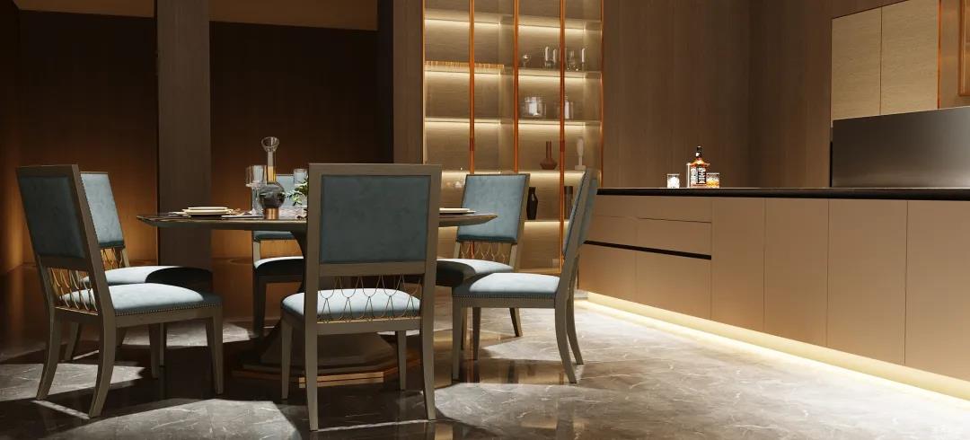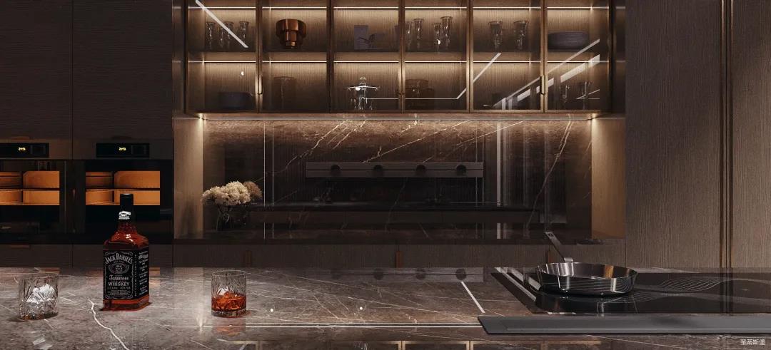 餐廚的極簡也可兼具多元,以一字內(nèi)嵌式展開的廚區(qū)收納柜,兼顧了從杯具、調(diào)料等廚用材料收納到廚電歸置動線功能處理。在展示區(qū)域,玻璃隔板組合實木定制柜的表現(xiàn)形式,更是提升了空間的明亮度與寬闊感。