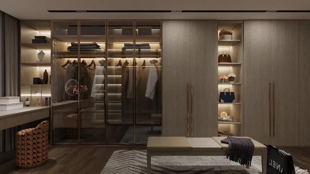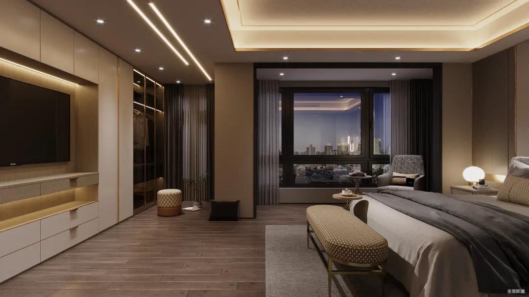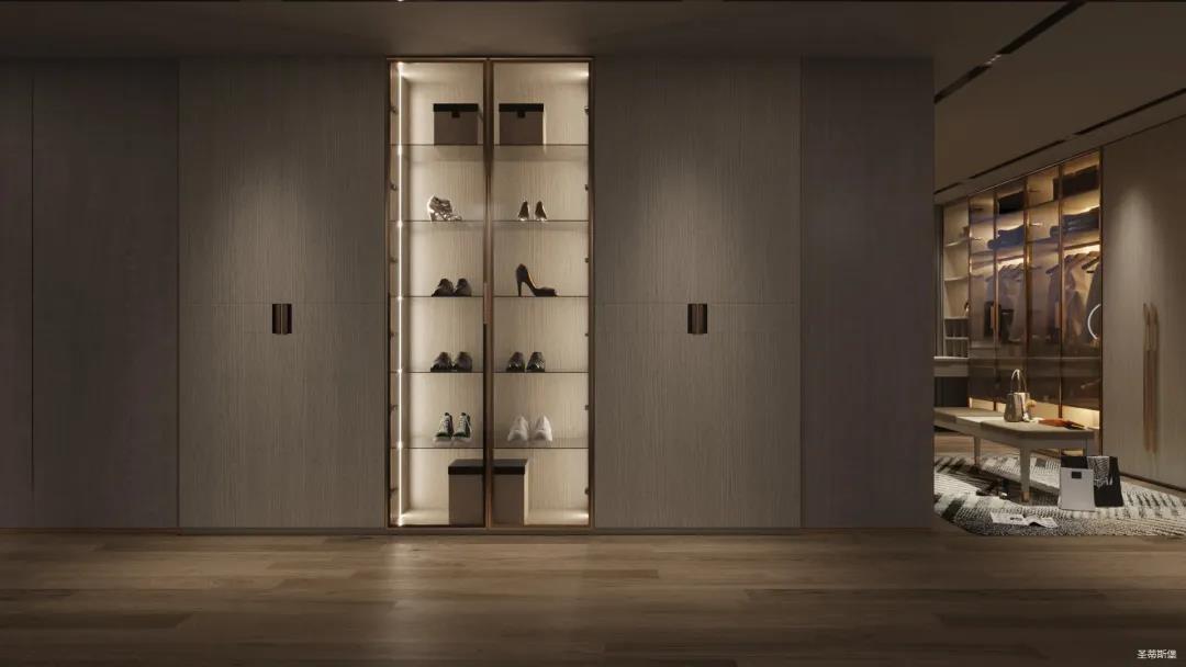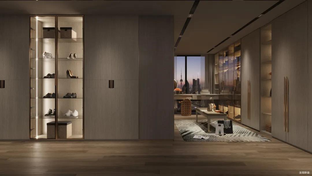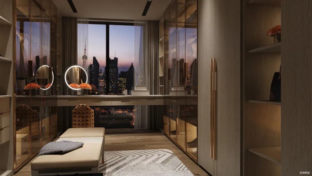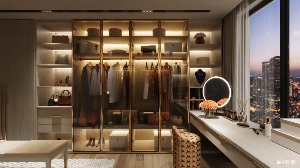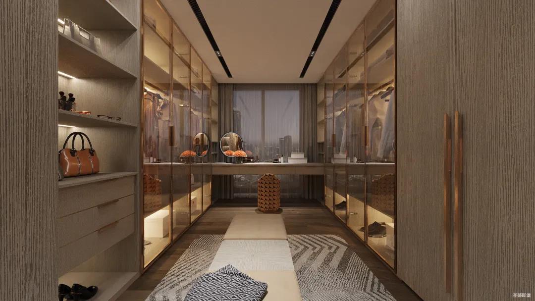 移步衣帽間,精簡華麗幾乎貫穿了整個空間,質(zhì)感高級的實木定制柜框架、通透明亮的玻璃展示區(qū)、色調(diào)醇厚的金屬鑲邊,每一項細節(jié)搭配都在強調(diào)著業(yè)主的高端品位。妝臺前的落地窗讓我們在觀賞都市繁華的同時也屏蔽了都市喧囂,讓我們置身于繁華都市中有一處寧靜休憩地。