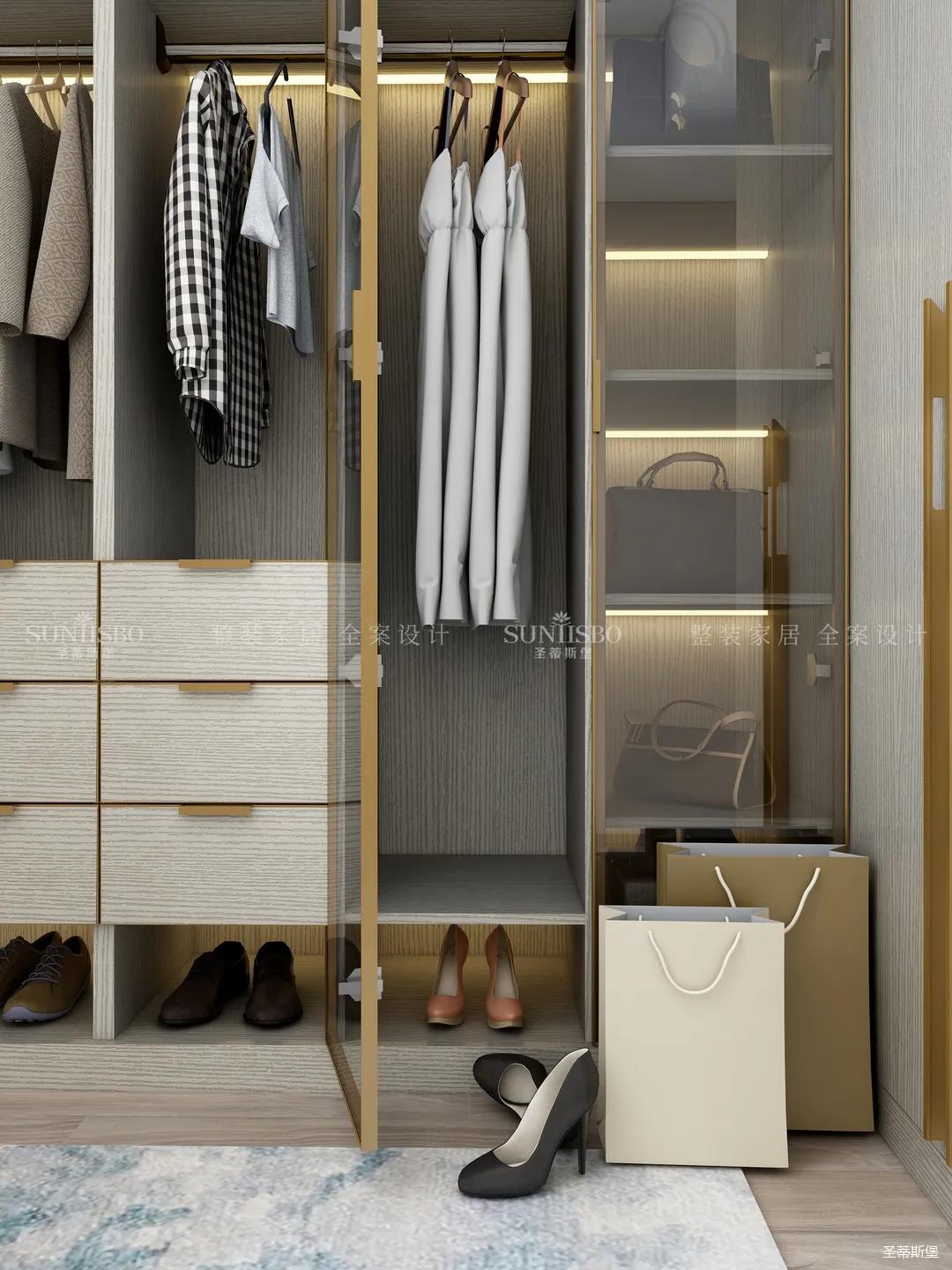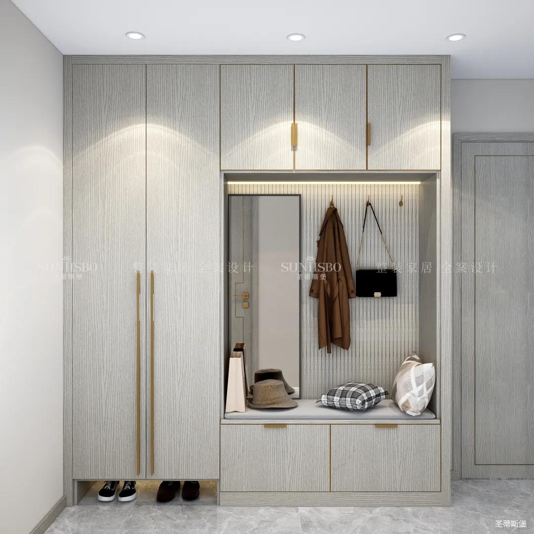進入玄關區域就能感受到房主對時尚風格的偏愛,實木元素與簡奢金屬的碰撞,既有對材質的甄選,又有現代簡奢的品質感。穿衣鏡、換鞋凳、收納柜等藏漏有序的分區,將屋主的生活歸納的井井有條。