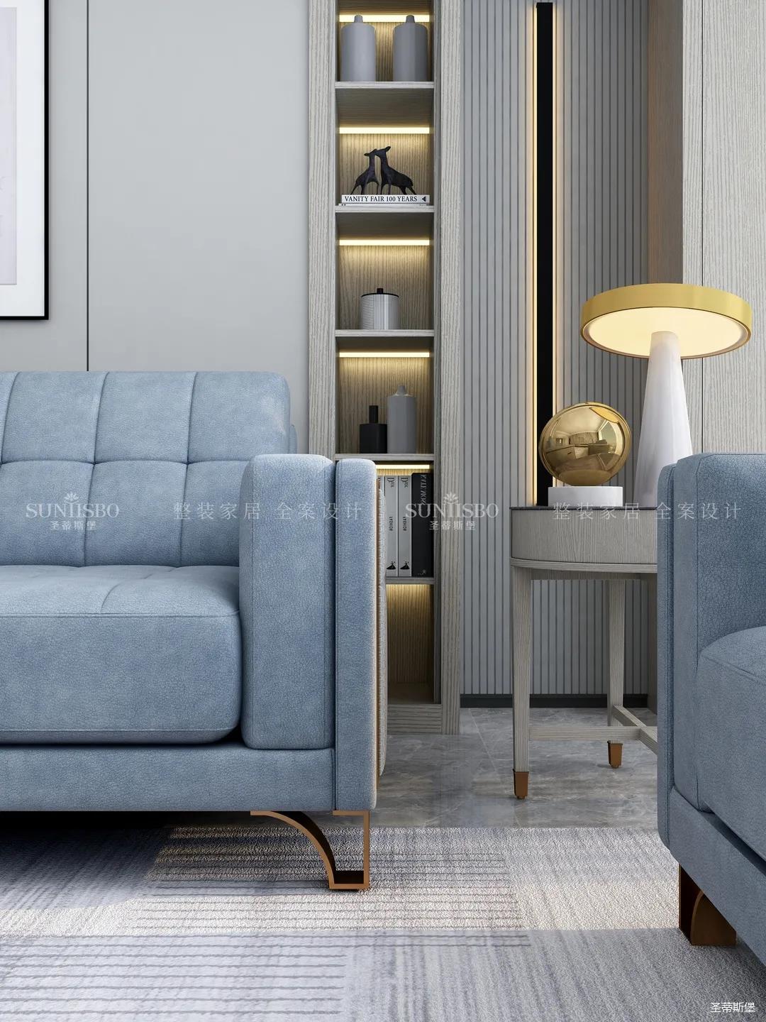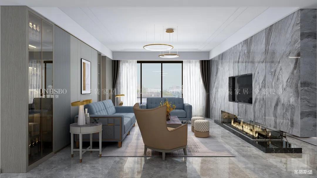 精細結構下沙發角幾的微金屬結構,干凈利落,彰顯質感。整面大理石背景墻將電視設計為壁龕結構,底部的裝飾壁爐讓家的溫馨感再度升級。