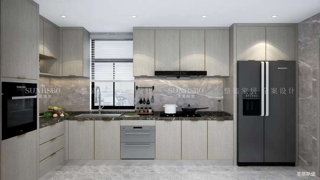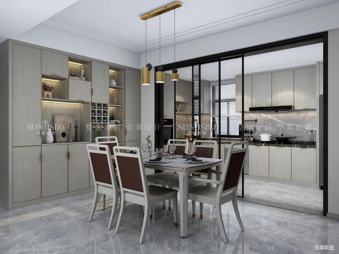 廚房餐邊柜的設計不遺余力的表達了收納充足藏而不漏,空間經過設計斟酌,將木元素作為空間主流,柜體上最能體現質感的歲月紋理,既是工藝升級的表現,又是時尚的標志。