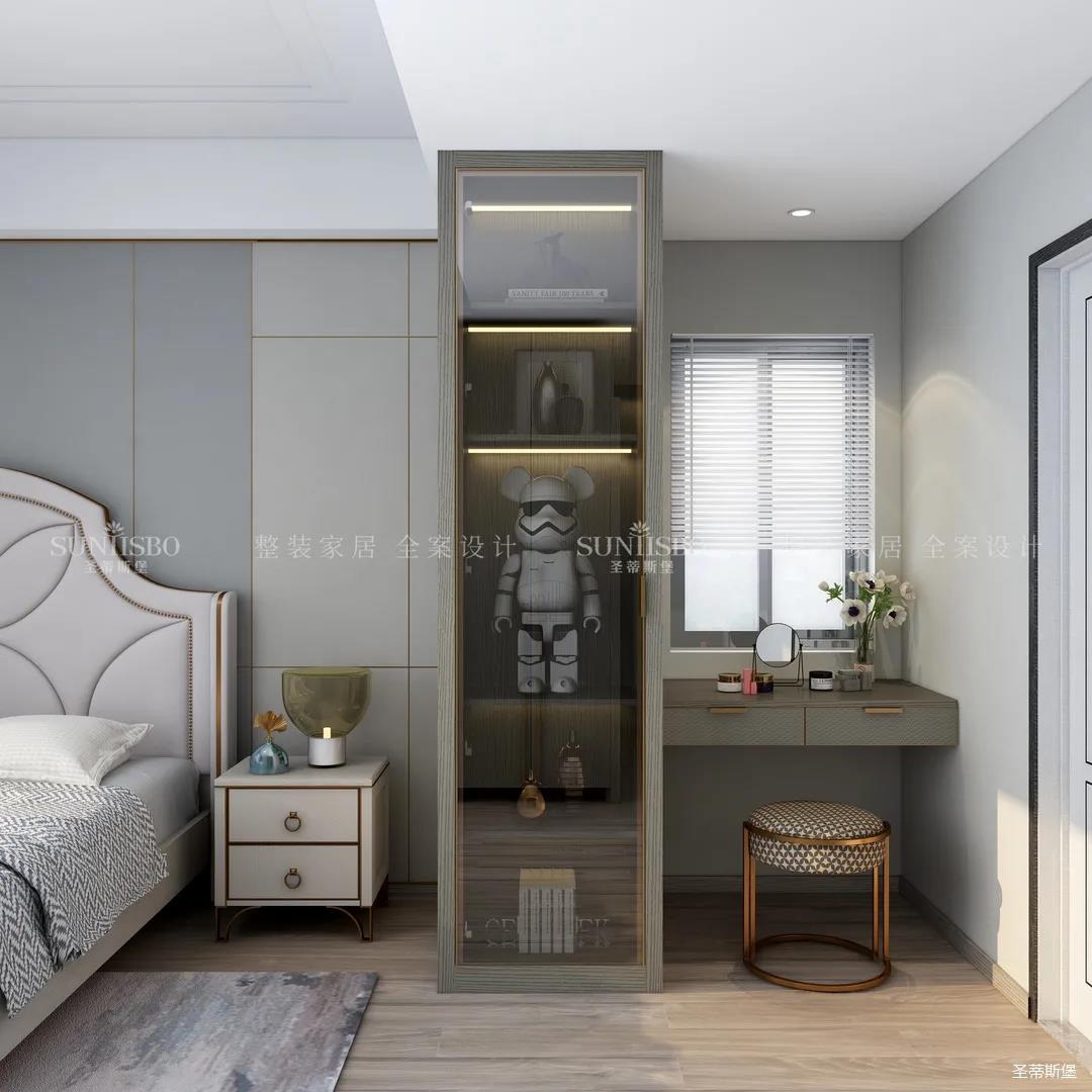 主臥的設計,整體風格與色調的一致,通過空間設計與軟裝細節的調控,顯得主臥多了一份寧靜與放松。四照花床屏的細節、材質色彩的把握、隔斷小書桌的設計,無不體現著設計師獨特的品位和全案設計的能力。
