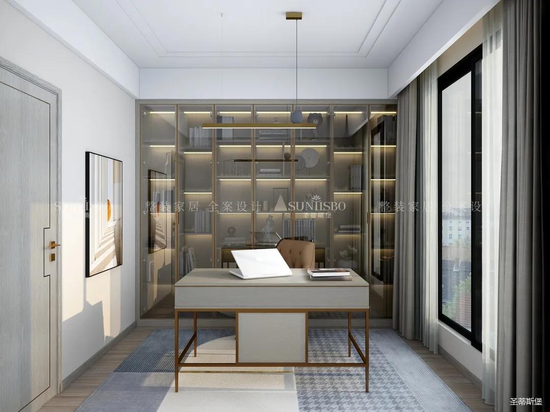 書房在陽光下襯得通透自然,半透明的灰玻利用高級且親和的色彩貫穿著柜體與空間的互動,溫潤的木質、輕奢的金屬以拼合的狀態,將屋主感性與時尚的生活理念滲透進書房空間。不同材質的搭配為空間增添平衡感,使得緊繃的工作狀態得到放松。