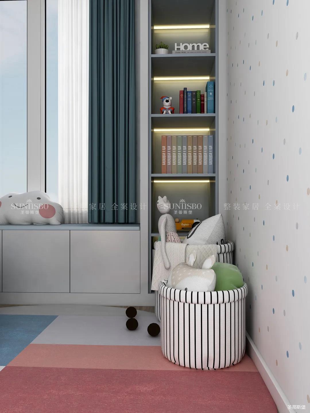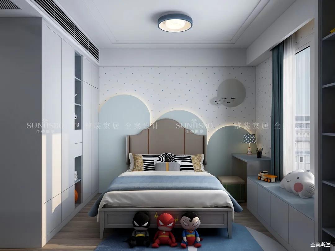 兒童房追求的是童真與自然,柜體的色彩與軟裝搭配完美呼應,云朵山峰的背景墻,以特立獨行的設計在視覺上讓心靈得到放空的意境。沿窗打造的飄窗格局,增加空間的功能性,造型簡約的柜體根據家裝理念摒棄了繁復的設計,更多展現的是空間自然之美。
