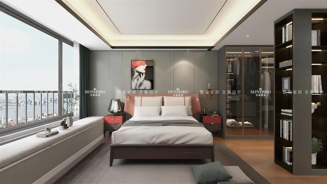 主臥的床是意式輕奢時尚與東方雅韻極致融合,沒有半點突兀和乖張。,意大利最出名的便是它的工藝與設計,時尚的莫蘭迪色系、輕奢金屬的運用,體現嫻熟的意式家具設計底蘊,兩者之間融合的相得益彰。