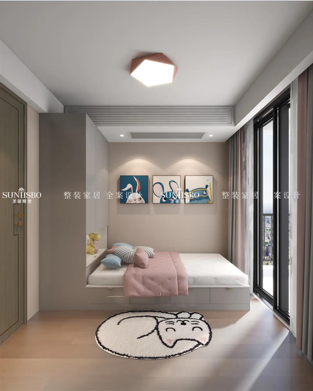 在設計之前,業主就預留了寶寶房,寶寶房實用又溫馨,榻榻米床可以做收納柜使用,收納寶寶的換季衣服、玩具等。在色彩上搭配也是采用的莫蘭迪色系。這樣的兒童房誰能不愛呢?
