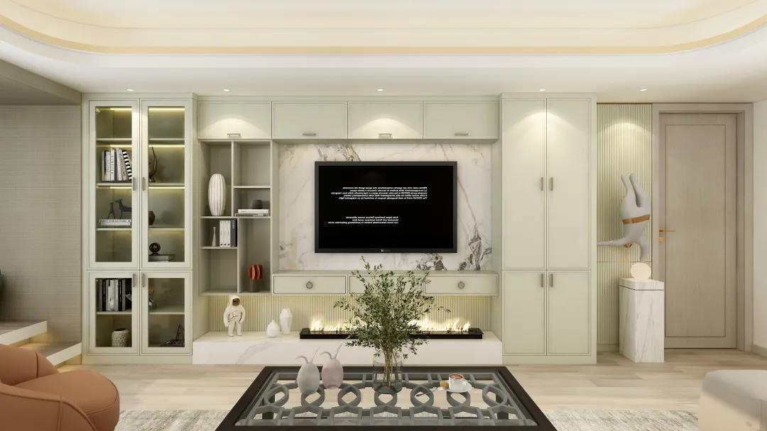 背景墻區(qū)域透過定制柜的材質(zhì)紋理、立面線條、