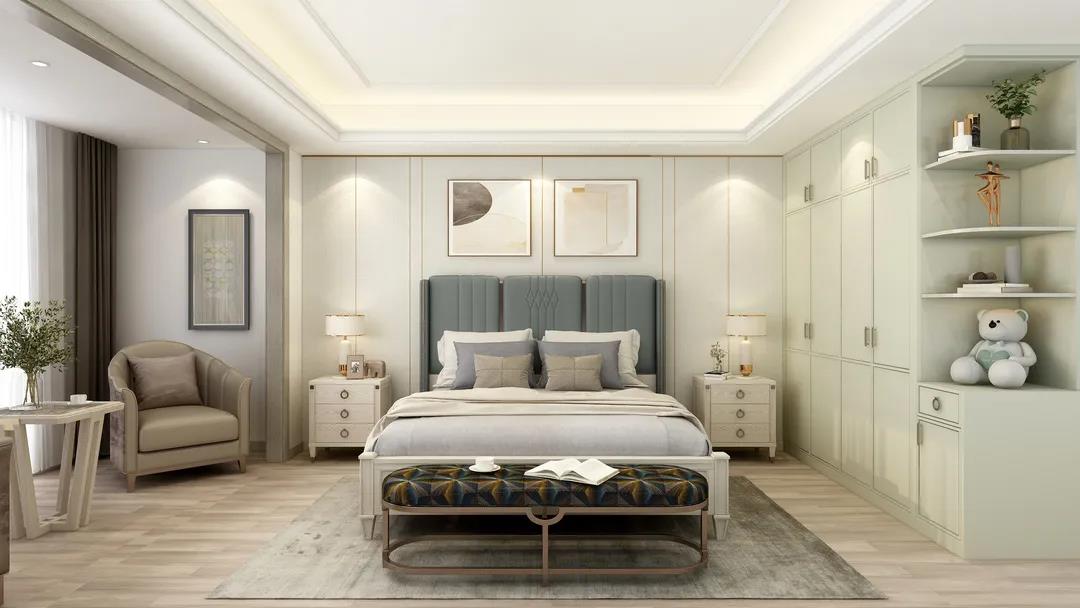 床尾凳的嵌入藍(lán)與床頭色調(diào)相呼應(yīng),
