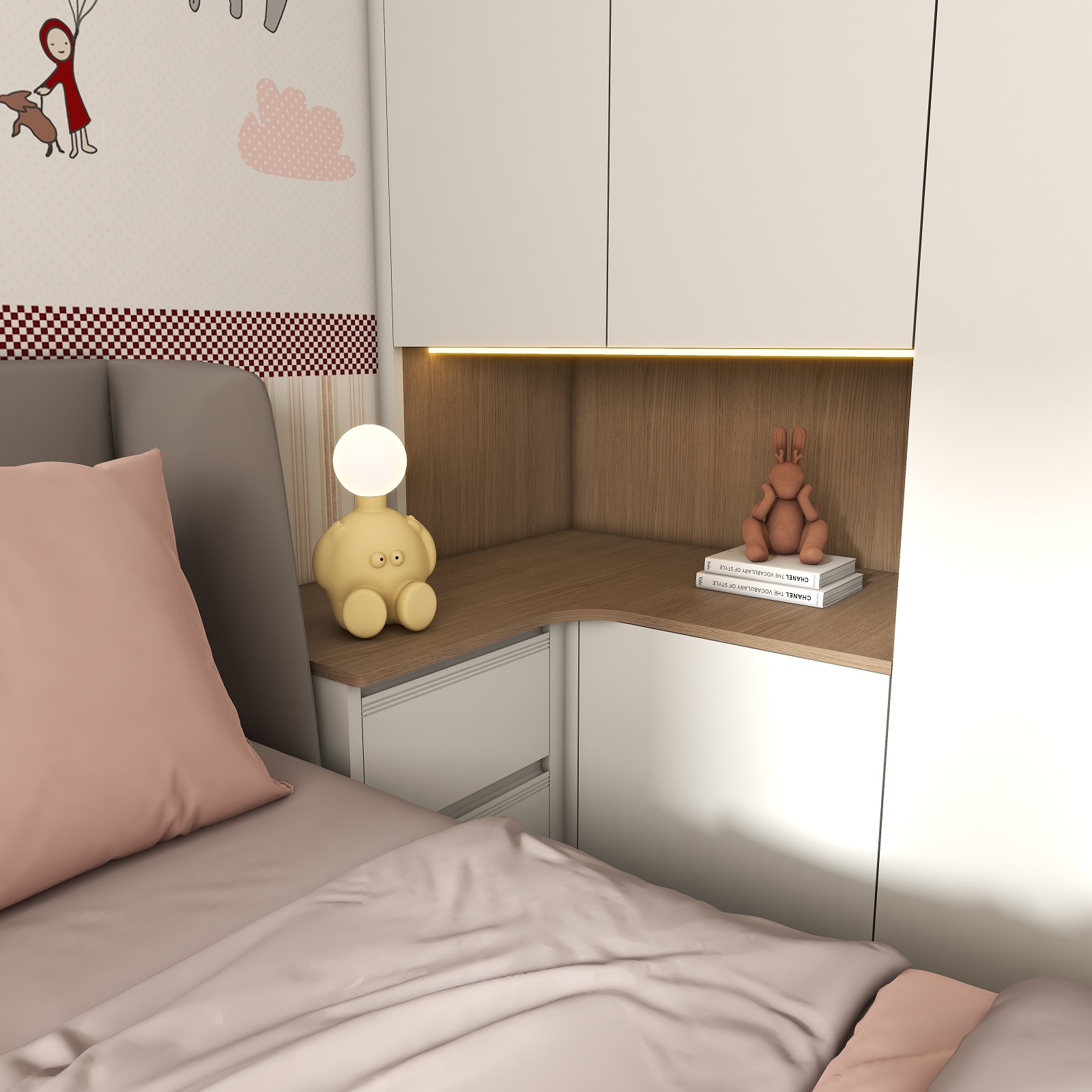 兒童房采用溫柔的奶白作為空間底色,整墻卡通貼畫(huà)搭配奶油白衣柜,在細(xì)節(jié)上用粉色裝飾作為跳色,無(wú)形中增加立體感和層次感,營(yíng)造出童真舒適的兒童夢(mèng)中情房。